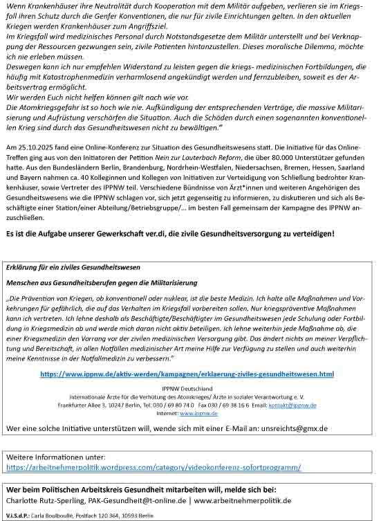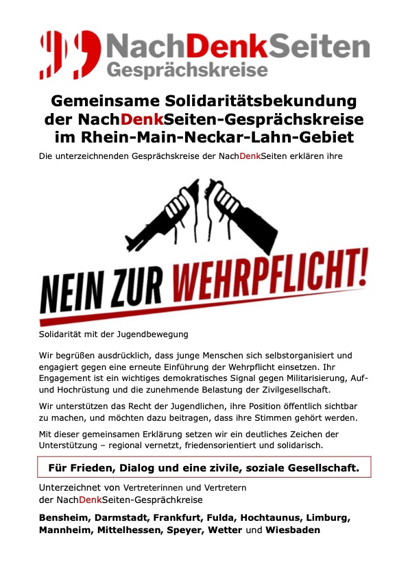 5.12.2025 In Deutschland nimmt die Kriegsmaschine Fahrt auf, bei Rheinmetall klingeln die Kassen und „Kriegstüchtigkeit“ ist das Gebot der Stunde. Kürzlich hat die Bundesregierung ein neues Wehrdienstgesetz auf den Weg gebracht, dass sich vom Grundsatz der Freiwilligkeit verabschiedet.