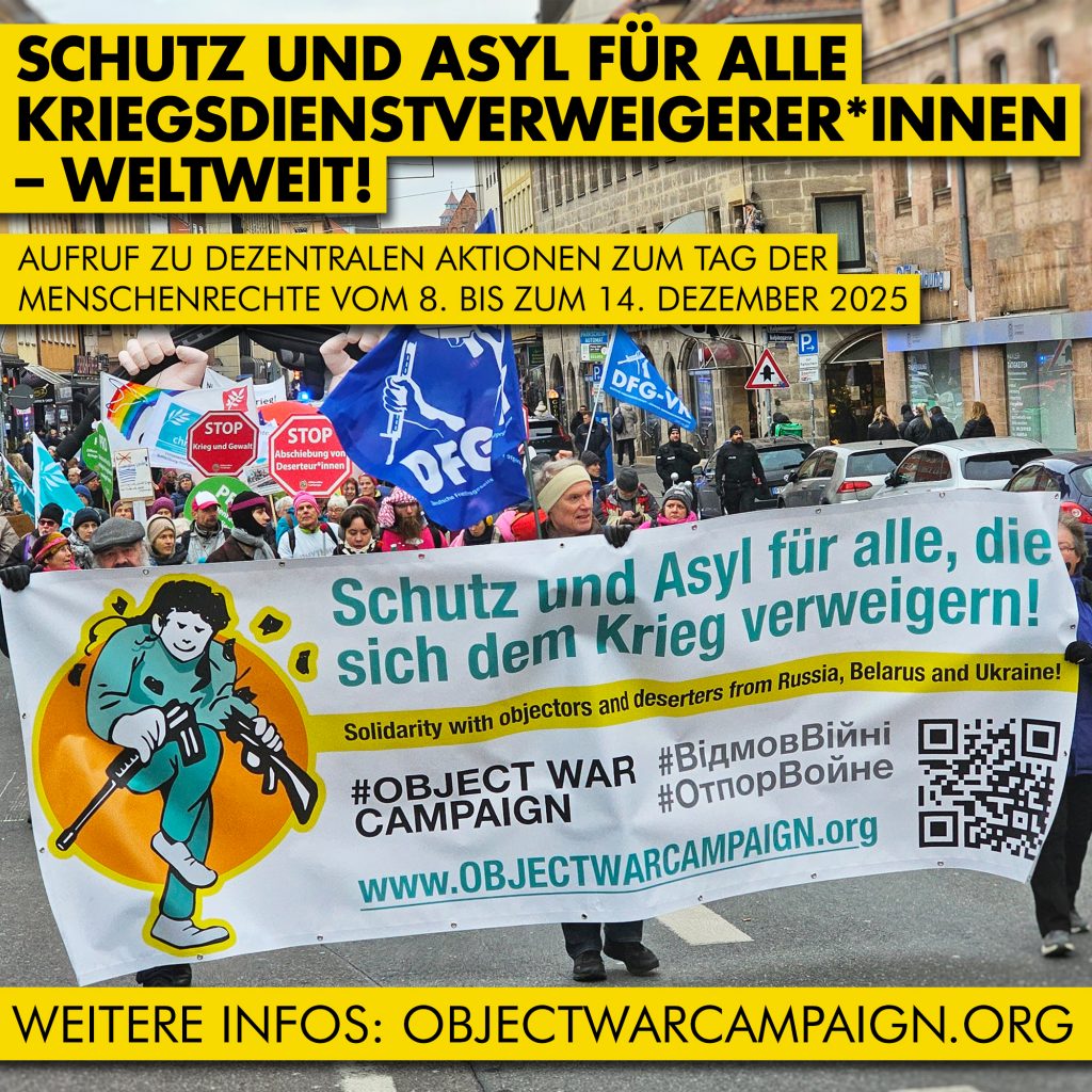 Schutz und Asyl für alle Kriegsdienstverweigerer*innen – weltweit! Aktionswoche zum Internationalen Tag der Menschenrechte am 10. Dezember 2025 – Aufruf zu dezentralen Aktionen vom 8. bis zum 14. Dezember 2025. weiterlesen: