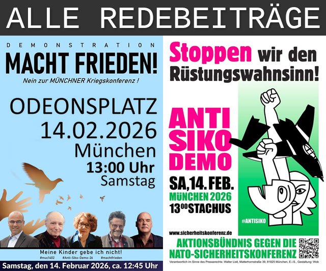 16.02.2026 Auf der Demo gegen die Münchner Sicherheitskonferenz hat am Samstag auch Sevim Dagdelen gesprochen. Sevim Dagdelen, 1975 in Duisburg als Kind kurdischstämmiger Eltern geboren, ist eine deutsche Journalistin und Politikerin der Partei „Bündnis Sahra Wagenknecht“. Seit Dezember 2025 ist sie im Bundesvorstand des BSW. Von 2005 bis 2025 war sie Bundestagsabgeordnete. Ihre Hauptbetätigungsfelder sind außenpolitische Themen sowie Migration und Integration. Wir dokumentieren hier ihre Rede. (Nachdenkseiten)