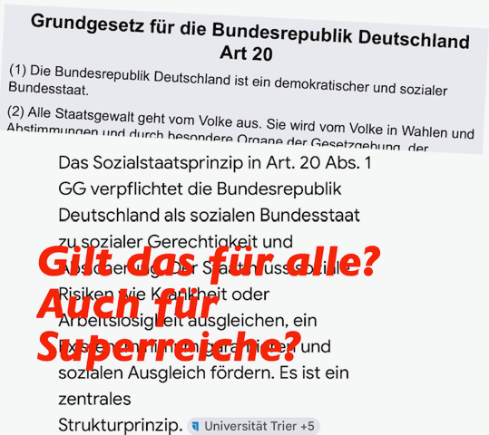 In Deutschland werden die Reichen und Superreichen mit einem spezialisierten Klassensystem für bestimmte Berufsgruppen und auch mit der Beitragsbemessungsgrenze von einem wirklich solidarischen Beitrag zu den Sozialsystemen verschont. Warum eigentlich?