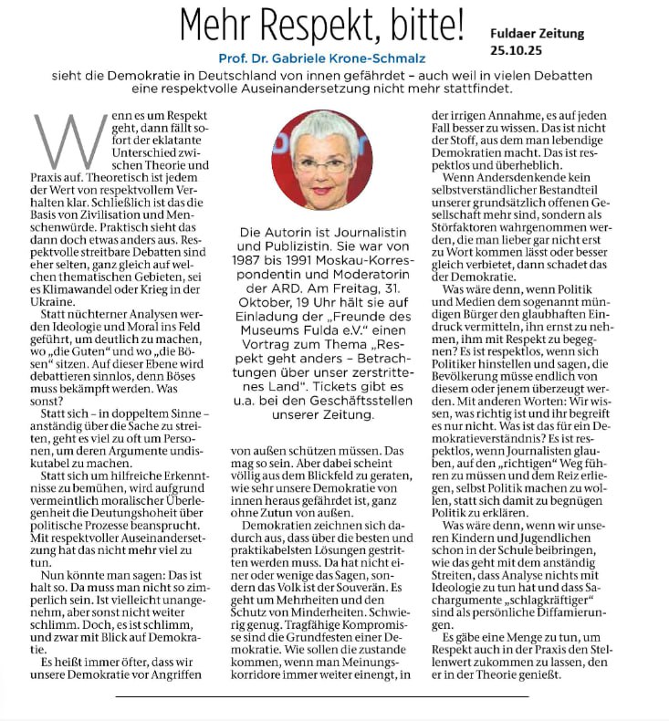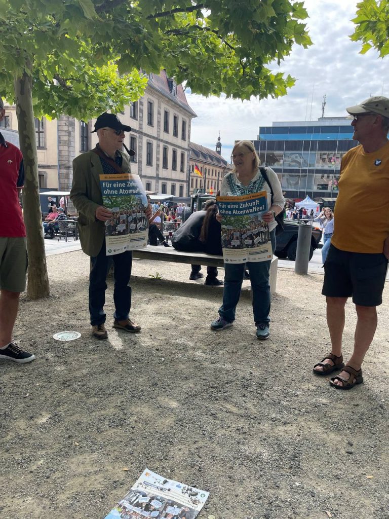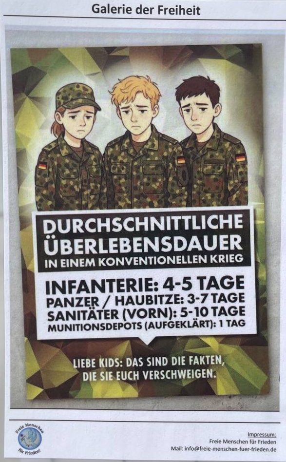 Gut, dass wir heute auch hier sind, „im Herzen der Domstadt“ wo der Tag der Reservisten gefeiert wird: https://www.fuldaerzeitung.de/fulda/in-fulda-bundeswehr-zum-anfassen-tag-der-reservisten-93872888.html und wir, um dem 80sten Jahrestag des Atombombenabwurfs auf Nagasaki zu gedenken und auf die reale Gefahr eines durch die westliche Wertegemeinschaft provozierten Atomkriegs hinzuweisen. Wie Iris Berndt in ihrem aktuell veröffentlichten und von mir vorgetragenen Artikel „Die Mädchen von der Honigbrücke“beschreibt, ist der geplante Angriff auf Kaliningrad eine Provokation, die den atomaren Gegenschlag auf die Kommandozentralen zur Folge haben wird- das entspricht der russischen Nukleardoktrin.