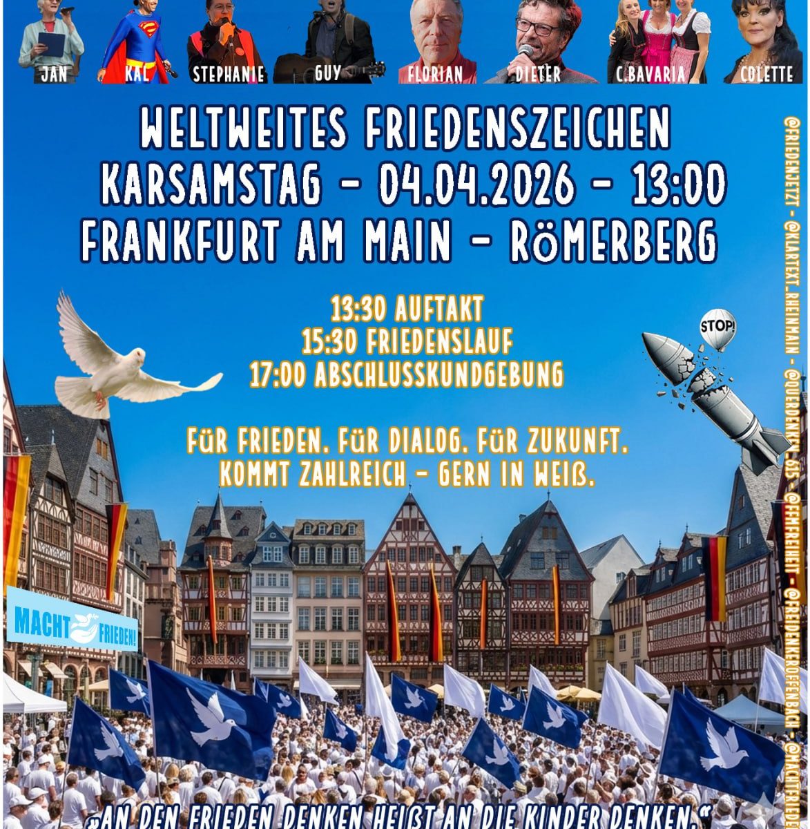 Der Römerberg wird an diesem Tag zum Ort der Begegnung: ein „Friedensmeer“ mitten in der Stadt. Wenn Sie kommen, bringen Sie nicht nur Ihre Stimme mit, sondern auch Ihre Werte: Frieden ist mehr als ein Wunsch – Frieden ist eine Aufgabe. Im Inneren wie im Äußeren. Gerade weil politische Diskussionen häufig in Lager zerfallen, ist ein sichtbares Friedenszeichen wichtig: respektvoll, würdevoll und klar.