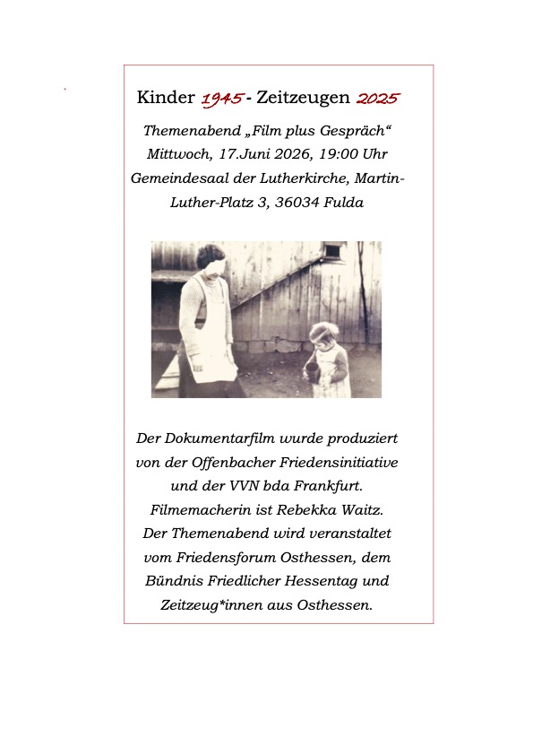 Kinder 1945 – Zeitzeugen 2025 17.Juni 2026 , 19:00 - 20:30 Gemeindesaal Lutherkirche, Martin-Luther-Platz 3, 36043 Fulda