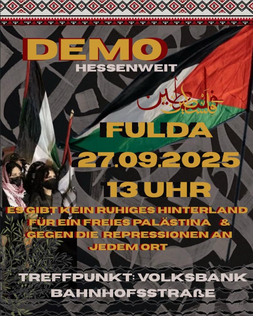 Die Besatzungsmacht Israel begeht einen Völkermord in Gaza – durch gezielte Aushungerung, Bombardierungen und systematische Zerstörung. Deutschland unterstützt diesen Genozid mit allen Mitteln und kriminalisiert gleichzeitig Palästinenser:innen, Muslim:innen und solidarische Menschen. Die letzte Demo in Fulda hat gezeigt: Polizeigewalt und die Unterdrückung pro-palästinensischer Stimmen sind Alltag in Fulda, Hessen und in ganz Deutschland! Wir sagen: … |